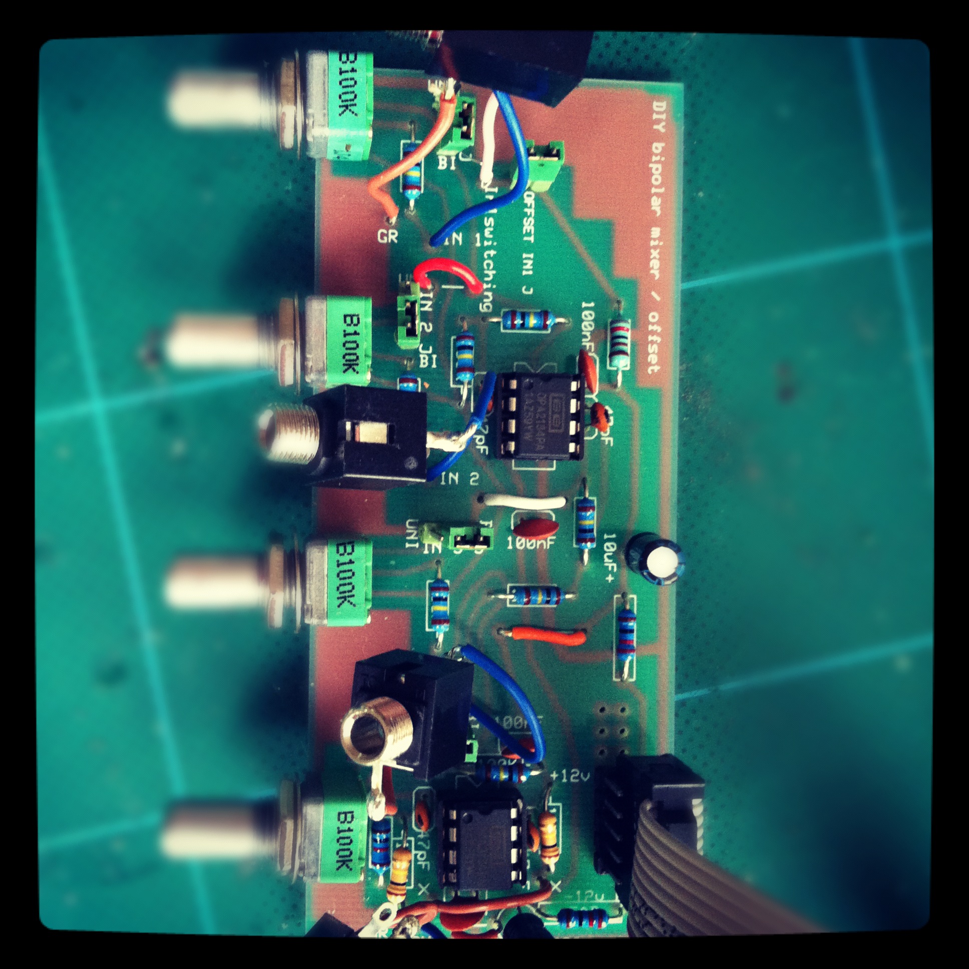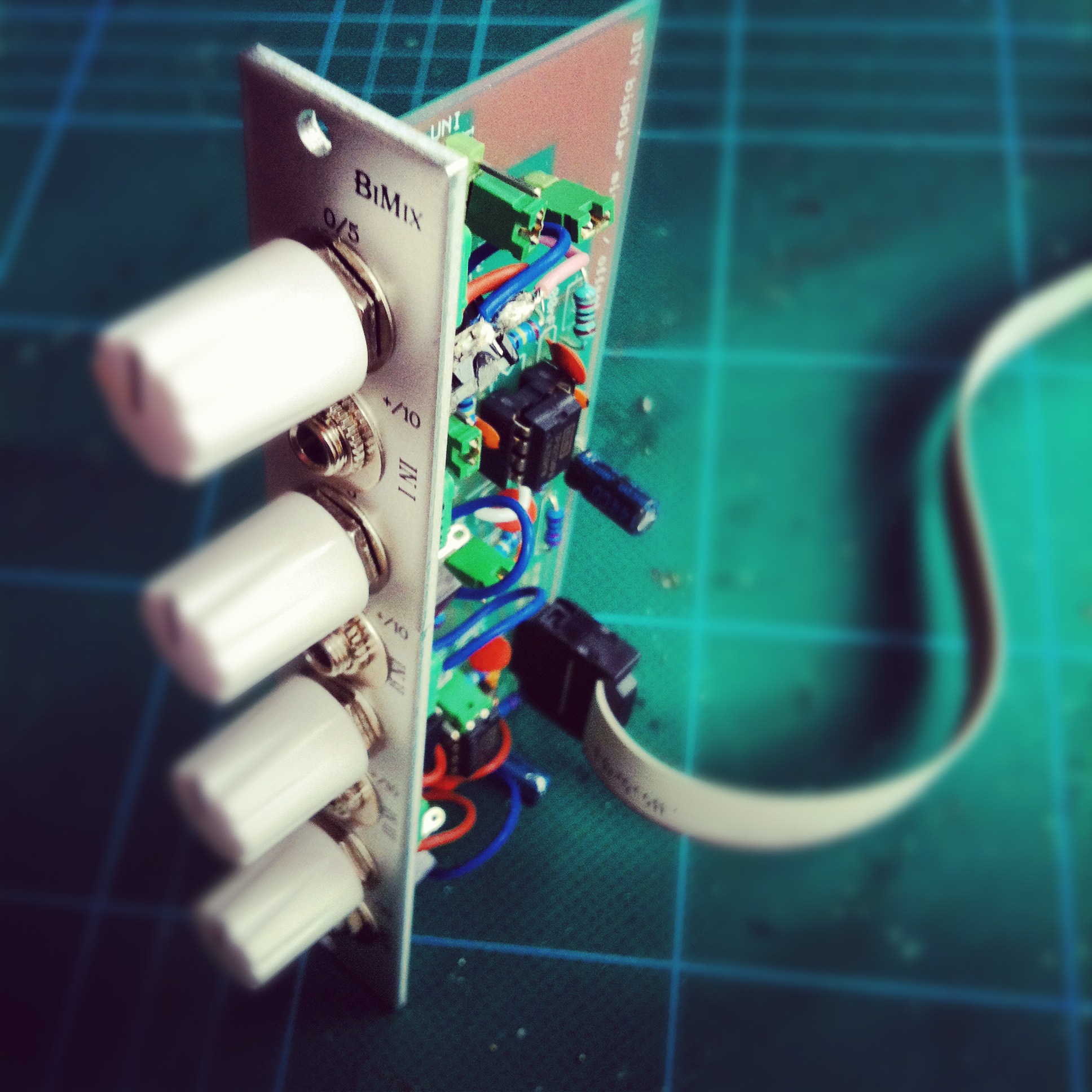 I have a small case for my modular synth, and dream of keeping it that way, and there are not many compact commercial offerings for bi-polar mixers… So, courtesy of theabsent, a madly impressive man from Finland, who has built a monster DIY modular, offered a kit called the BiMix – three channels, with an offset on channel one, in a neat little 4hp package.
