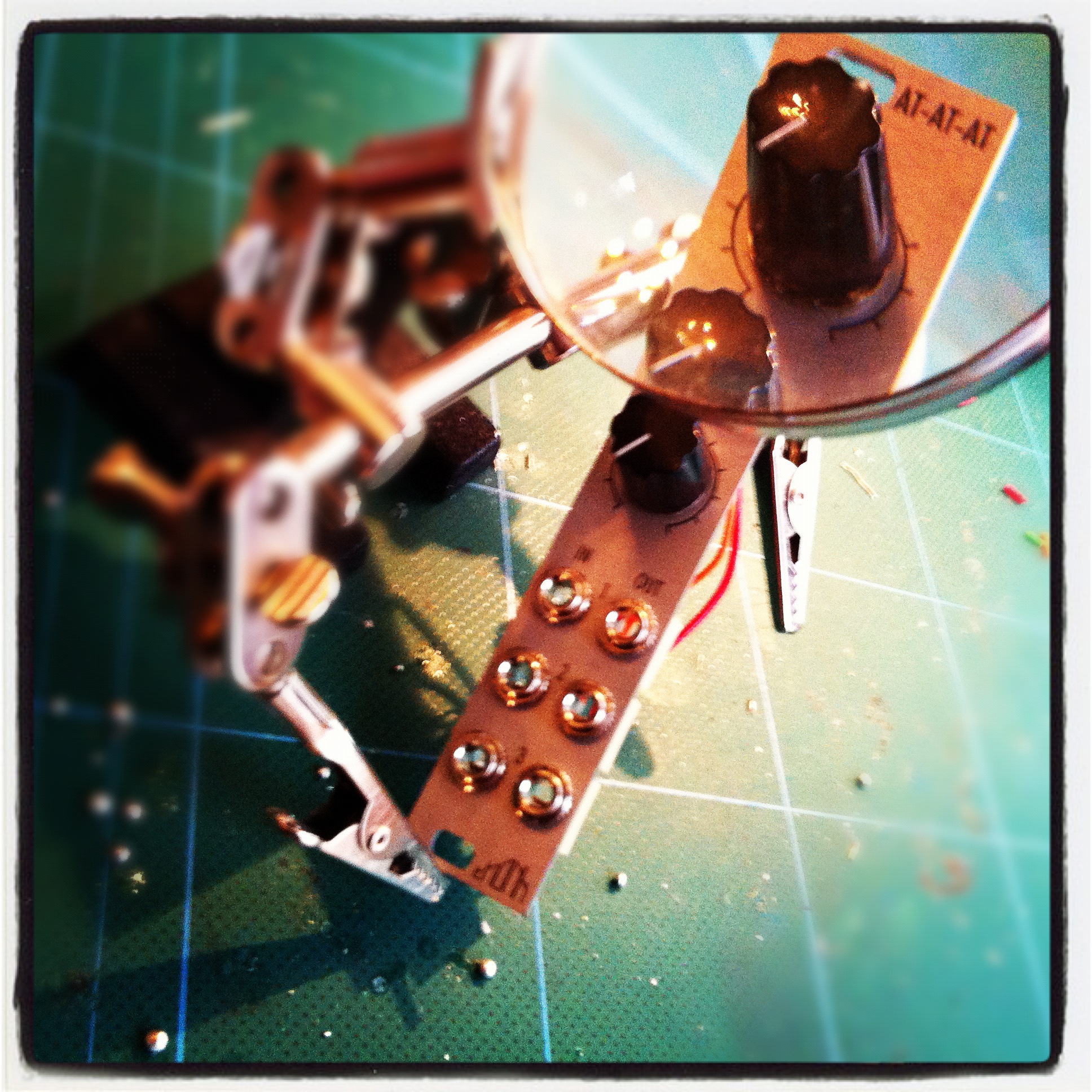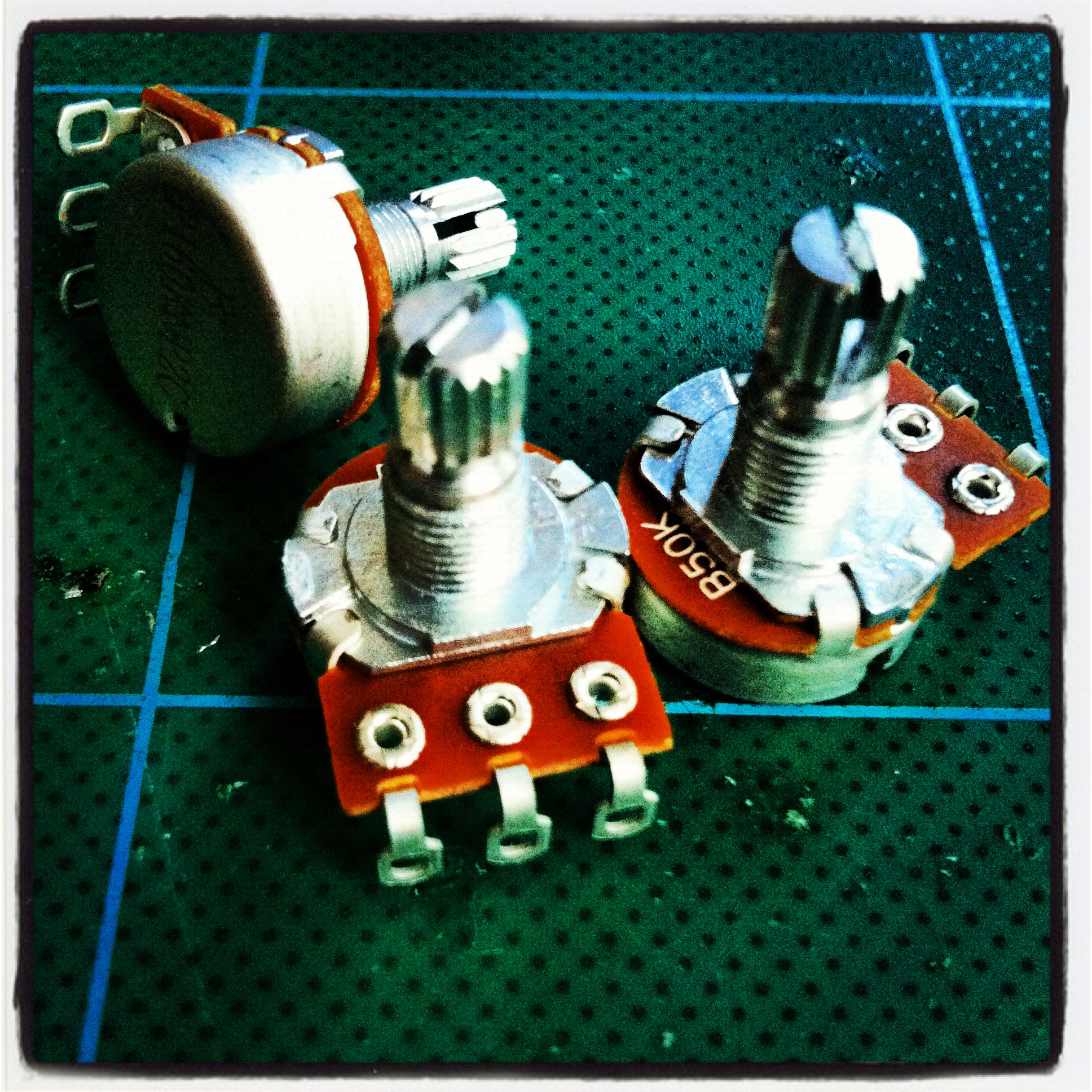 Since I went to the Brighton Modular meet in the summer of 2012, I wanted an AtAtAt… It’s a very simple passice triple attenuator, which is very handy in the modular world. The AtAtAt is offered by Thonk, which has a few offerings to DIY for modular synth types.