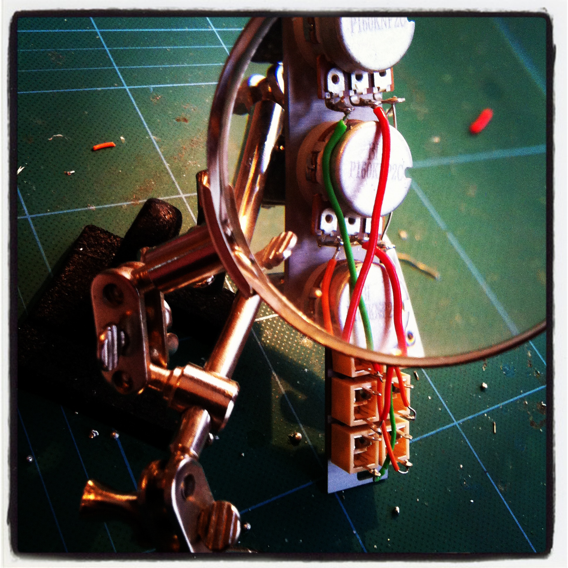 The kit comes with everything required barring a soldering iron, screwdriver and wire cutters. The documentation is available online, and makes this simple project even easier – what’s great is no knowledge is assumed, and a few neat tricks shared, particularly around grounding lots of components neatly (which would have taken me a long time to work out for myself) and re-cycling the annoying little tab on potentiometers.