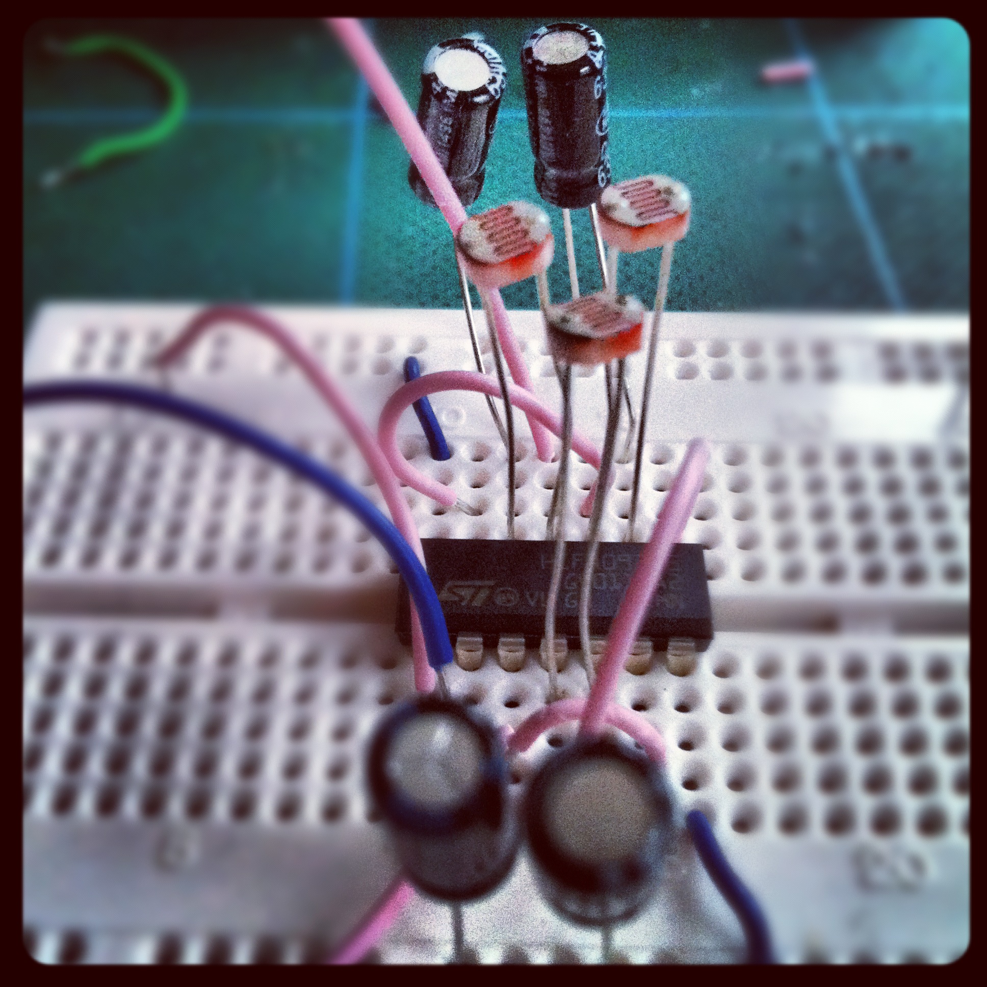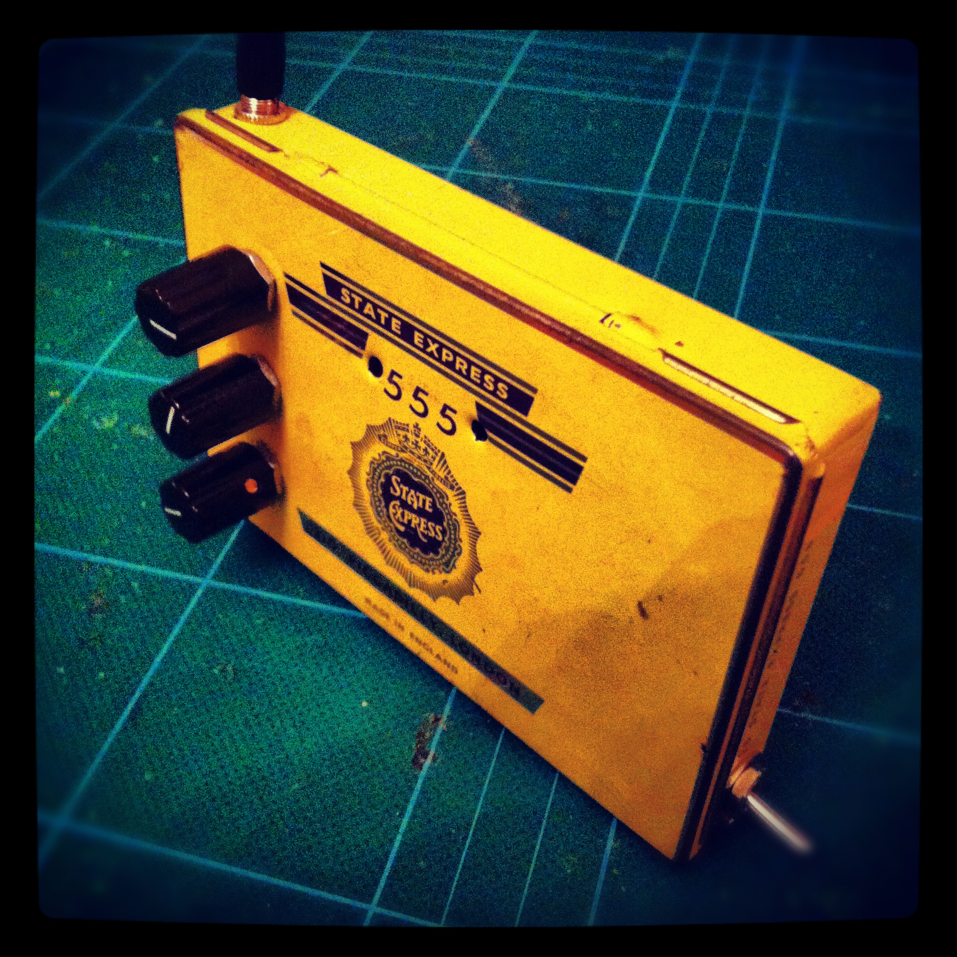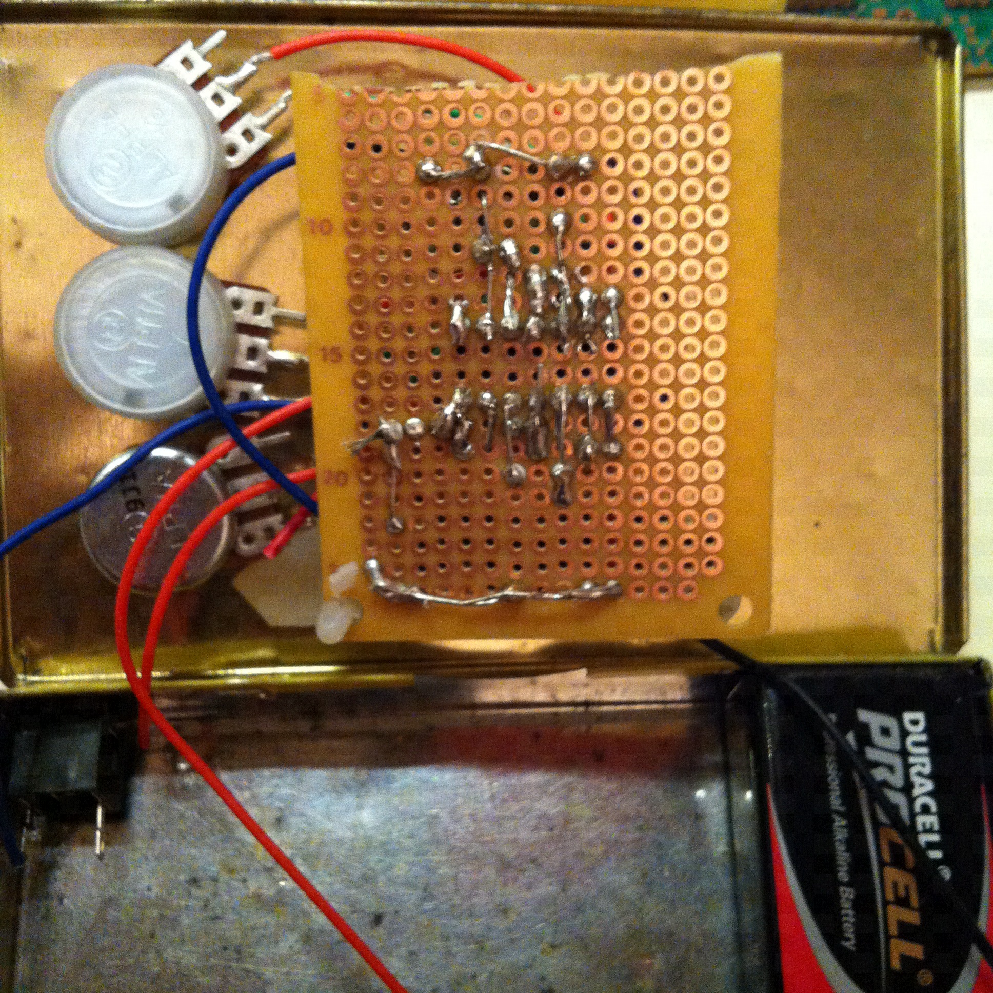 Obviously, dry-running the noisebox was important, and I found my crappy Behringer EQ pedal straight away, but took the best part of an hour to find the little battery powered amp (it has been a long time since it was needed). The breadboard version didn’t take long to get making some noise, and became a lot more fun when additional LDRs were added so all the four pairs of gates available started interacting with one another.I started the actual build quite quickly, but it took a while. My aim was to build this into a little cigarette tin I picked up at a market a few weeks. The tin is small, may 100mm x 65mm x 10mm, and the first thing I did was hack my smallest padboard so there would be clearance to close the lid. I decided a I wanted a switch for the battery, and messed about trying to work out the best locations for everything. I also decided to swap a couple of the LDRs for potentiometers. I used some random reverse log taper 100k pots I had lying around, as well as a linear 1m pot for the first gate. I also added the super simple low pass filter for kicks (just a low value capacitor and another LDR).