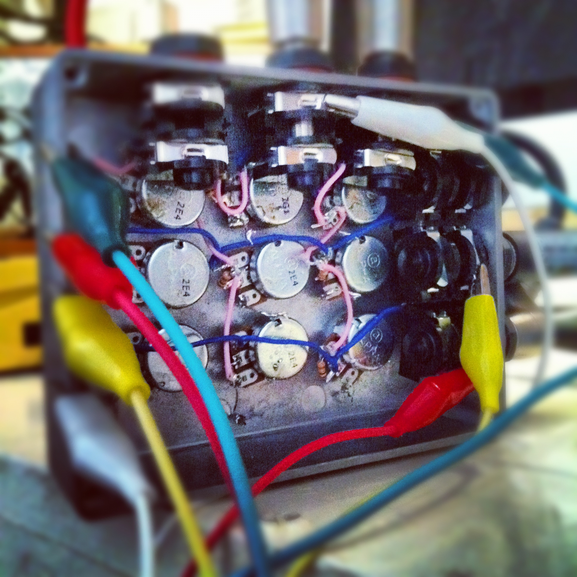 10b should have been more straight forward, especially as the jacks were much smaller, but I forgot the discipline of the first build in the intervening two weeks, and inadvertently joined up the wire such that each row potentiometers were in series, rather than matrix mixing. More swear words, and a quick de-solder/re-solder session, and this one was working as nicely as the first. Until, that is, one of the potentiometers ‘snapped’ – which isn’t to say that it came off, rather than it started turning through 360 degrees. Out came the guts again and a replacement in place. All good, and now the temptation is to build a bigger one…